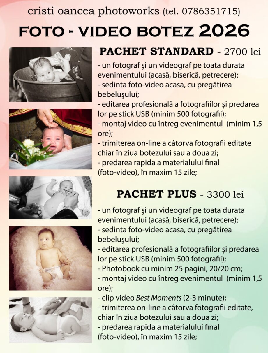 Dragi prieteni, mai jos sunt prezente noile pachete de bază pentru foto și video la botez. Ofertele și prețurile sunt valabile pentru Câmpulung Muscel și zonele apropiate. Pentru detalii suplimentare sau pentru alte zone din județul Argeș precum și pentru pachete personalizate vă rugăm să luați legătura cu noi în pagina de Contact.